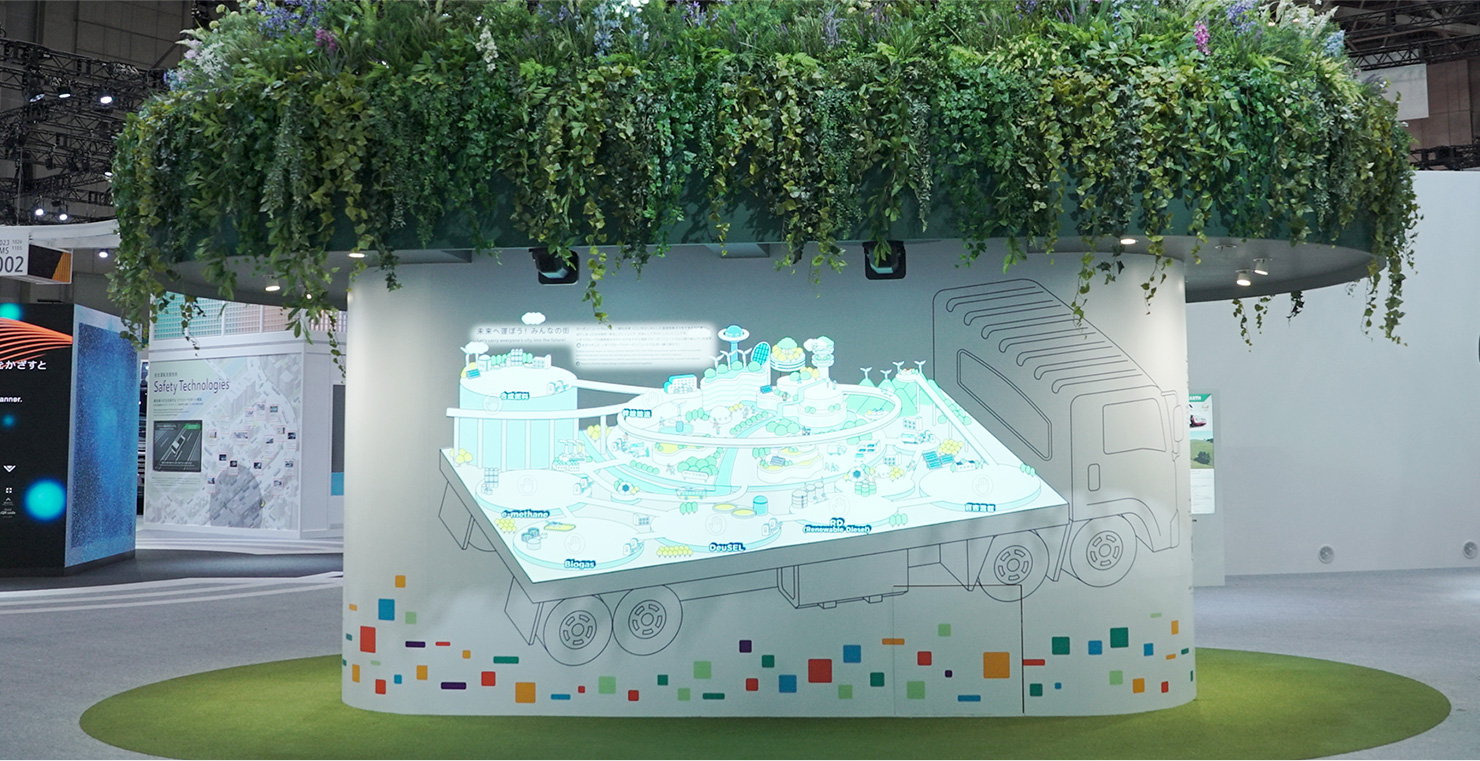 商用車EVの導入から運用までのさまざまな課題解決を提案するシステム「EVision」と、商用車EVで実現していくカーボンニュートラルを映像で展示します。