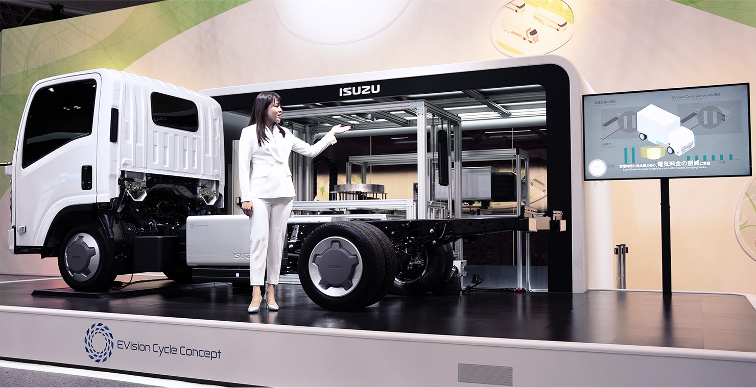 商用車のカーボンニュートラル化の選択肢の一つであるEV(電気自動車)。充電にかかる待機時間を短縮することで「物流を止めない」いすゞグループのシステムをデモンストレーションでご紹介します。
